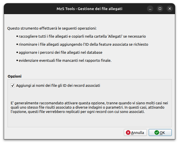 I file possono essere opzionalmente rinominati in modo automatico aggiungendo ai nomi gli ID degli elementi a cui sono collegati, in modo da facilitare la loro identificazione e permettere l’utilizzo dello Strumento di consultazione rapida indagini.