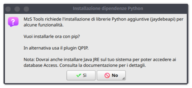 librerie Python (JayDeBeApi) per l’accesso alle funzionalità Java, installate tramite lo strumento integrato del plugin (vedi: Controllo delle dipendenze del plugin) oppure tramite il plugin per QGIS QPIP (da installare separatamente).