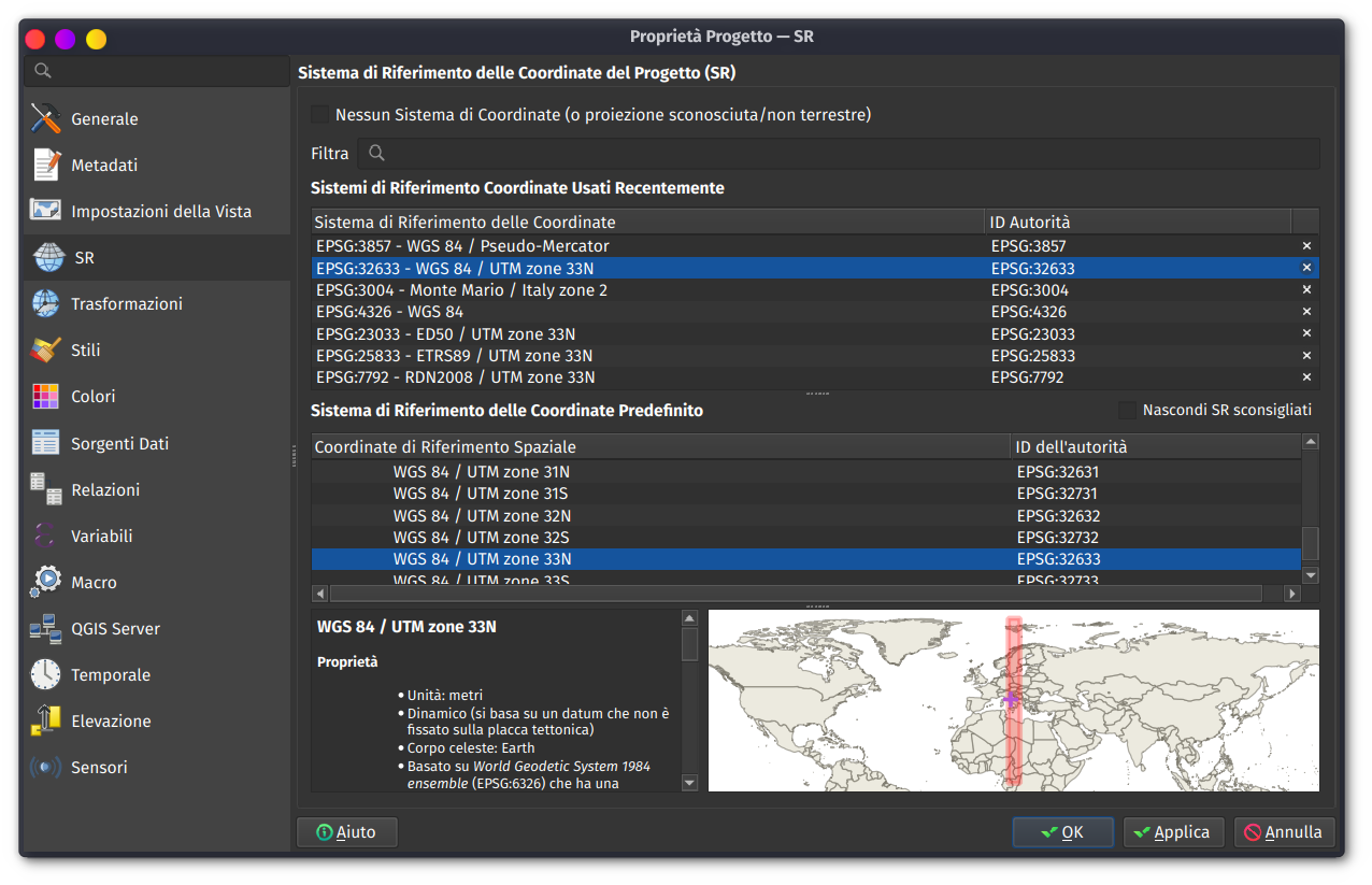 Tuttavia, è possibile modificare il sistema di riferimento del progetto QGIS in base alle esigenze specifiche del proprio studio, tramite il menu Progetto - Proprietà del progetto - SR. Questa impostazione modifica il sistema di riferimento del progetto QGIS, ma non modifica il sistema di riferimento dei dati presenti nel database, che rimangono in WGS84 UTM Zona 33N e vengono proiettati dinamicamente nel sistema di riferimento del progetto durante la visualizzazione.